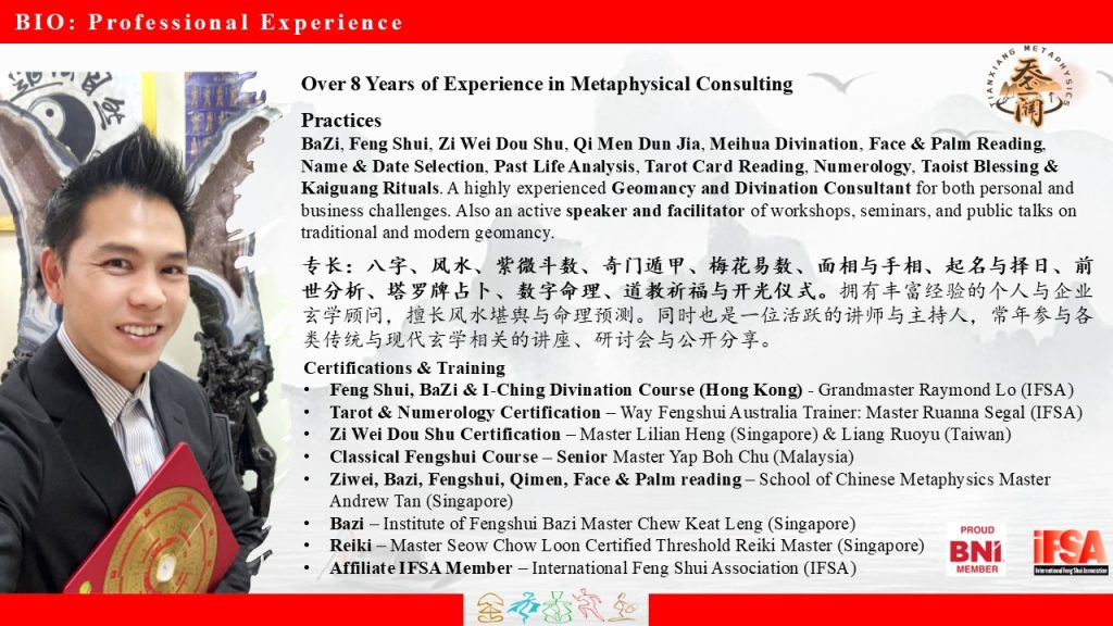 Discover the timeless wisdom of Feng Shui, Bazi, Numerology, and Tarot to transform your life and achieve harmony in all aspects. Whether you're seeking clarity, growth, or guidance, I am here to help you unlock your potential and overcome challenges with confidence.