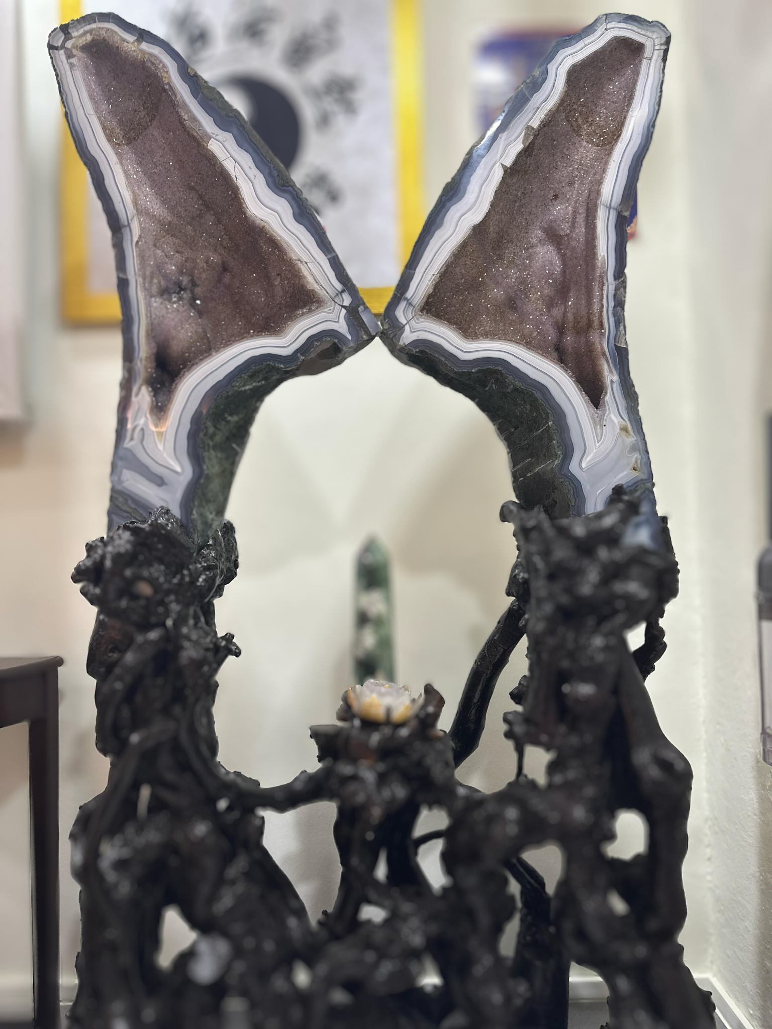 • Crystal Growth: The twin amethyst formations are a result of crystals growing simultaneously or interconnecting in a way that creates mirror-like structures within the geode.